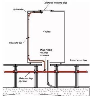 典型的吸氣式感煙火災(zāi)探測(cè)器的安裝方式,所有盤內(nèi)的空氣樣品透過軟管匯流到采樣管送到探測(cè)主機(jī)進(jìn)行煙霧檢測(cè),利用管路及軟管抽取機(jī)柜內(nèi)部的空氣進(jìn)行分析。
