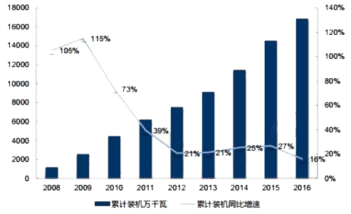 綜合國內(nèi)外的數(shù)據(jù)來看, 截至2016年,我國風(fēng)電新增裝機達約占全球風(fēng)電市場份額的42.7%,以絕對優(yōu)勢領(lǐng)跑全球風(fēng)電市場。而2016年國內(nèi)市場經(jīng)歷了風(fēng)電搶裝后的回調(diào),同時疊加電力需求下降和電網(wǎng)消納風(fēng)電能力不足,導(dǎo)致國內(nèi)市場的裝機容量明顯下滑,進而全球市場風(fēng)電新增裝機容量隨之下滑。