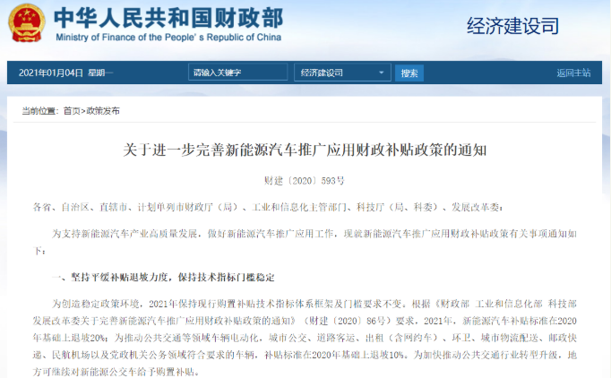 2020年最后一個工作日(12月31日),財政部、工信部、科技部、國家發(fā)展改革委聯(lián)合發(fā)布《關(guān)于進一步完善新能源汽車推廣應(yīng)用財政補貼政策的通知》,并于2021年1月1日起正式實施。《通知》指出,2021年堅持平緩補貼退坡力度,新能源汽車補貼標準在2020年基礎(chǔ)上退坡20%。