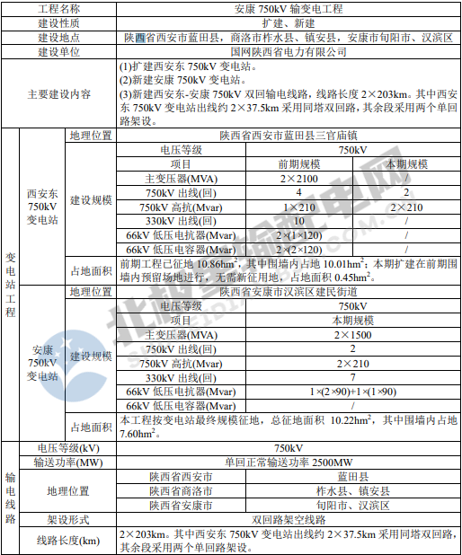 本工程建設(shè)內(nèi)容包括:擴建西安東750kV變電站,新建安康750kV變電站,新建西安東 -安康750kV雙回輸電線路,工程共涉及1省3地市5縣(區(qū)、市)。