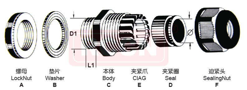 產(chǎn)品材質(zhì):A.C.E.F部位均采用環(huán)保尼龍66(NYLON66)原料制成.B.D采用耐老化橡膠材質(zhì)。產(chǎn)品認(rèn)證:UL/CUL:E348185,歐洲CE, 歐洲環(huán)保SGS,REACH,REACH,防爆EX認(rèn)證。