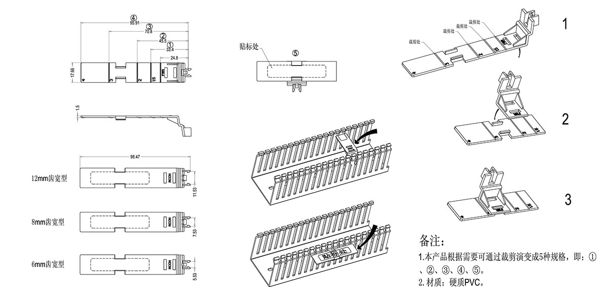 產(chǎn)品材質(zhì):采用低鹵素硬質(zhì)PVC料制成,環(huán)保無污染,不含鉛等有毒物。產(chǎn)品認(rèn)證:美國(guó)UL 歐洲CE,歐洲環(huán)保RoHS,REACH。防火等級(jí):UL94V-0,低煙微鹵,遇火不燃燒,防火性及絕緣性特佳。產(chǎn)品構(gòu)造:由身體和卡腳組合而成。顏?????? 色 :米黃色?。啥ㄖ破渌伾?,有起訂量要求)工作溫度 :靜態(tài)-40°C持續(xù)高溫至70°C。使用方法:根據(jù)槽寬選擇相應(yīng)的寬度即可。產(chǎn)品特性 : 主要用于槽內(nèi)或槽外標(biāo)識(shí)用。