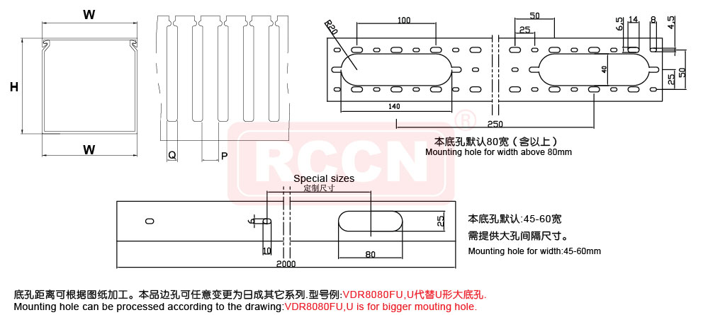 型號(hào)Item No. | 寬*高 W*H | 孔寬 Q | 齒寬 P | 電線容量 以2.0平方計(jì)算 | 裝箱 /M | |||